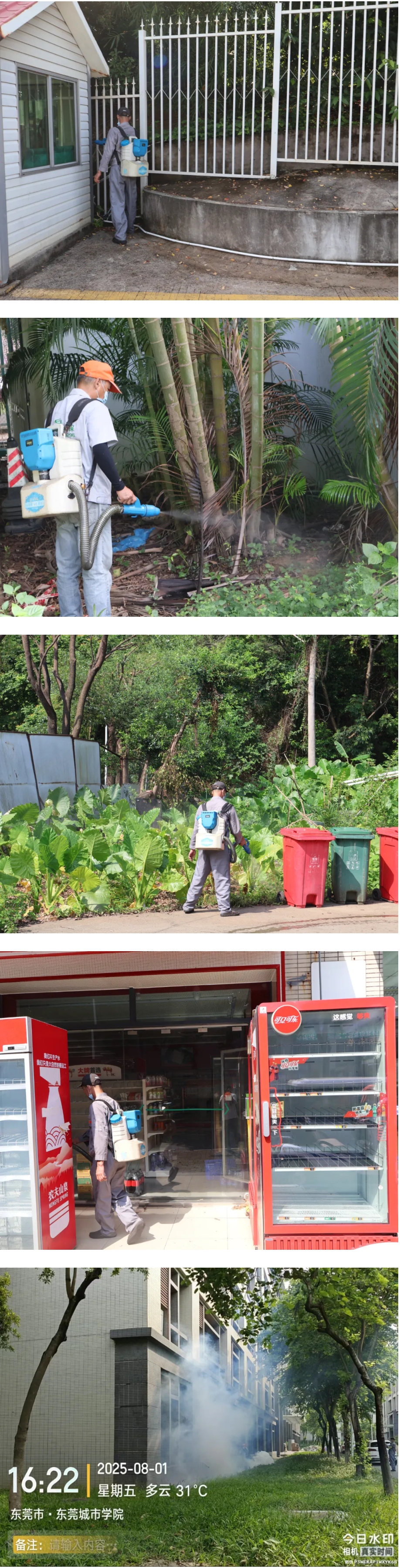 后勤保卫部联合专业消杀团队,对行政楼、教学楼、图书馆、综合馆、学生公寓、教师公寓、教工住宅、食堂等人员活动场所以及垃圾中转站、地下车库、绿化带、树林、下水井和下水道等易孳生蚊虫的重点区域进行了全面消杀。工作人员严格按照操作规范,采用科学配比药剂,确保消杀效果覆盖每个角落,从源头切断蚊虫传播链。