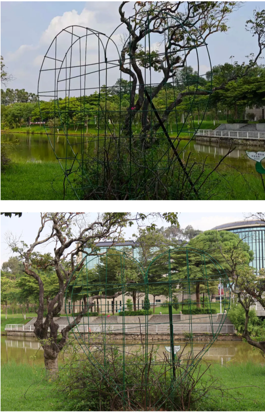 如今,这座爱心花架已静静矗立在映月湖畔。这次后勤搭建的爱心花架,不但把网红爱心打卡点搬进城院,更搬到师生的心里边。随着时间推移,三角梅的枝条将慢慢攀上钢架,玫红色的花朵会完全覆盖框架,形成一个巨大的"花之爱心"。无论是清晨读书,还是傍晚散步,师生们都将多一处赏景打卡的好去处。